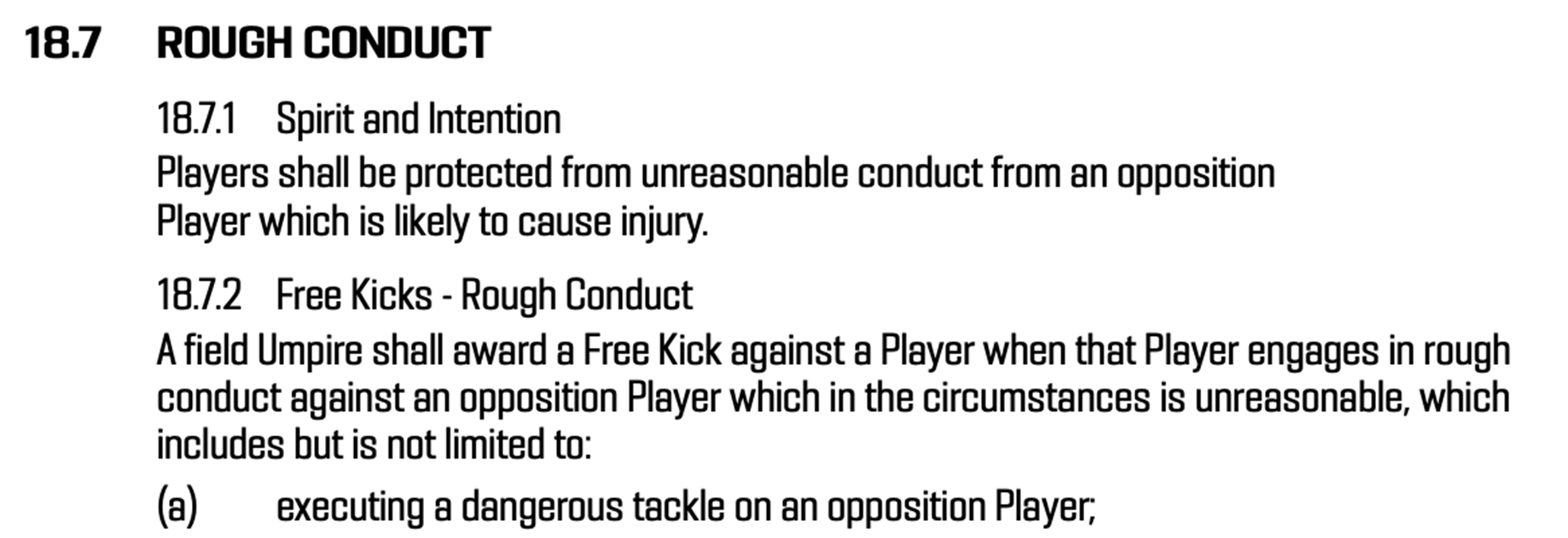 - In this instance the Somerville player rotates the body of the Mornington player in an excessive manner leaving the head in a vulnerable position. Whilst on the minor end of a free kick, we do want this paid. We would ask players in this instance not to take players to ground.